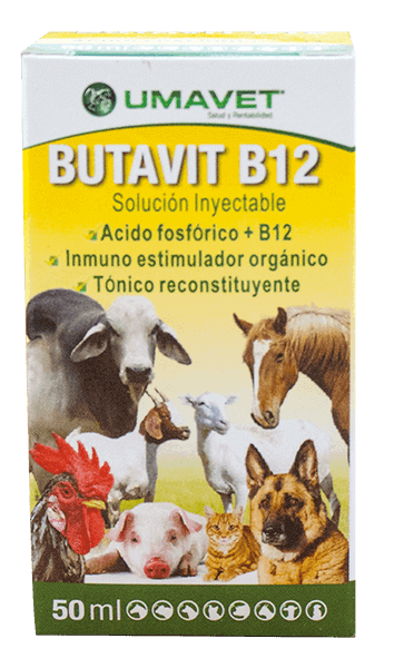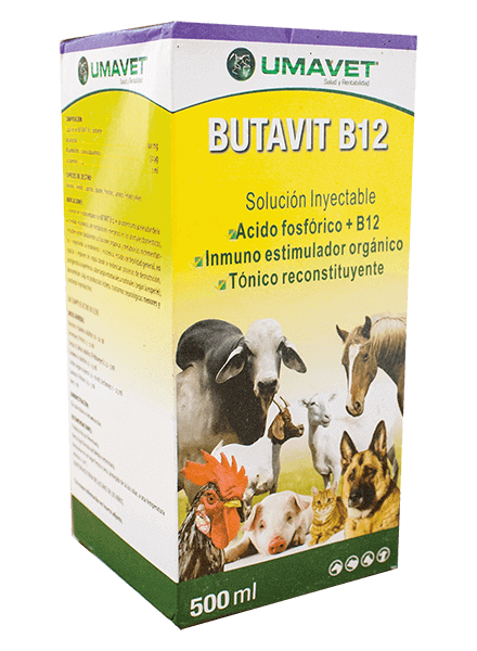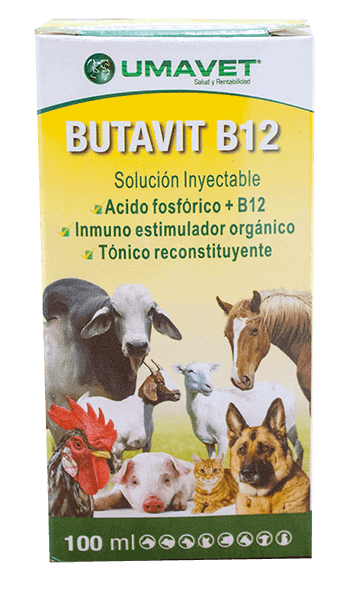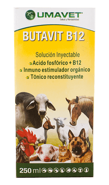 La fuente de Fósforo orgánico de BUTAVIT B 12, es un potentísimo acelerador de la actividad enzimática del metabolismo energético en los animales domésticos, restableciendo rápidamente sus funciones orgánicas y metabólicas, incrementando y mejorando su rendimiento y resistencia, estados de debilidad general, en épocas y regiones de sequía donde se evidencian procesos de desnutrición, corrigiendo la inapetencia, sobrecargas estomacales o ruminales (según la especie), desnutrición, baja en producción lechera, trastornos neurológicos menores y trastornos reproductivos.