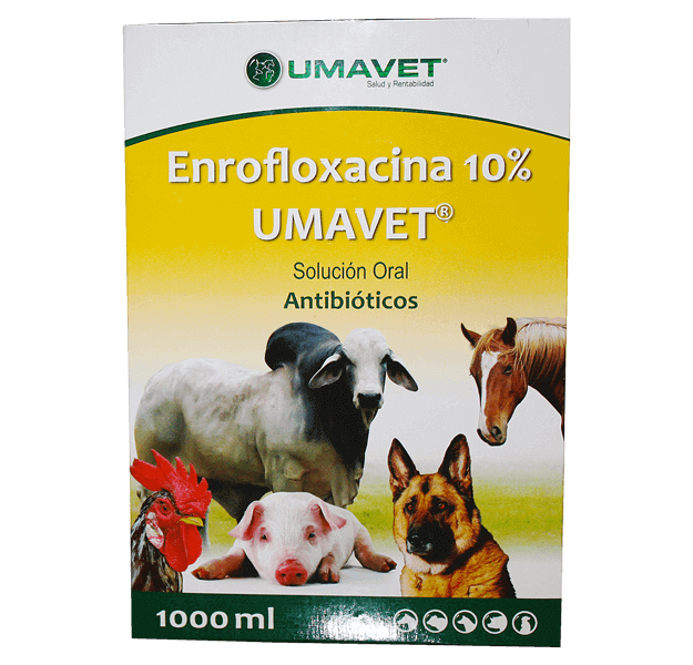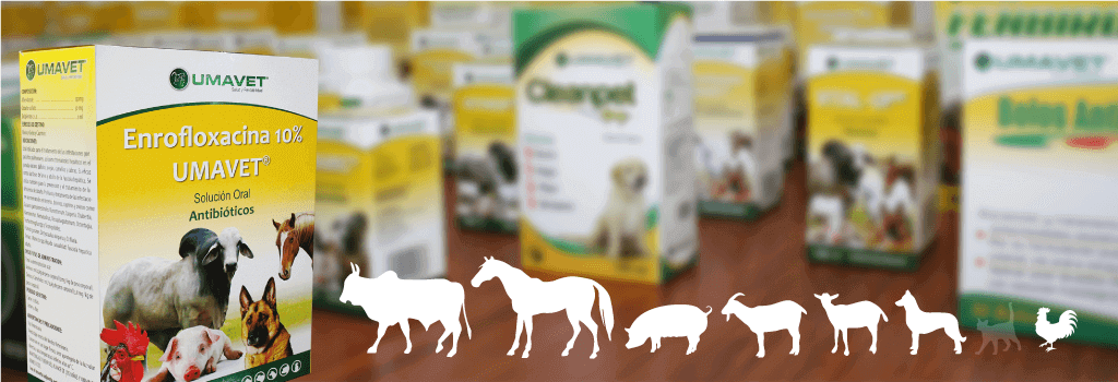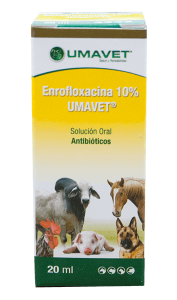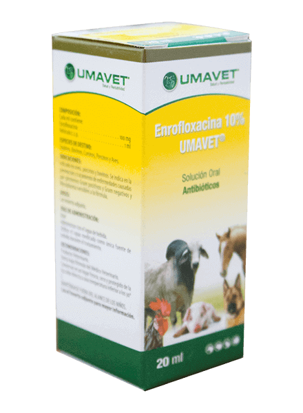 Enrofloxacina 10% Umavet® Solución Oral está indicado para el tratamiento y profilaxis de enfermedades infecciosas causadas por Gram-positivas, Gram-negativas y Mycoplasmas en aves, bovinos, porcinos, ovinos, caprinos y equinos.